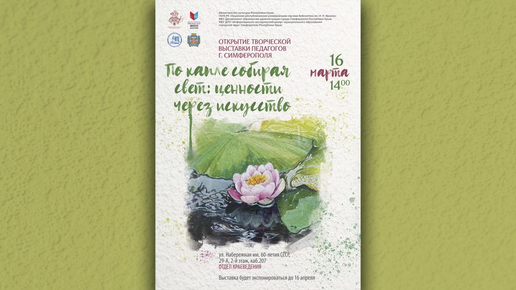 16 марта 2026 года в 14.00 в отделе краеведения состоится открытие творческой выставки «По капле собирая свет: ценности через искусство», организаторами которой являются МКУ Департамент образования Администрации г. Симферополя и МБУ ДПО «Информационно-методический центр» г. Симферополя.