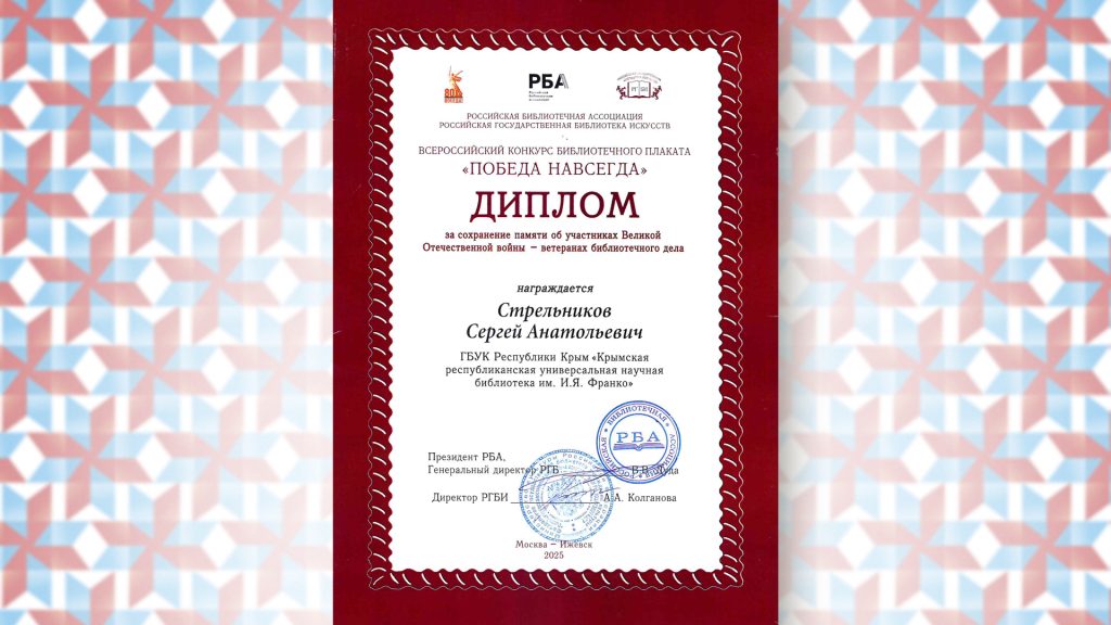 Всероссийского конкурса библиотечного плаката «ПОБЕДА НАВСЕГДА» Стрельникову С. А. от президента РБА, Генерального директора РГБ В. В. Дуда, директора РГБИ А. А. Колганова за сохранение памяти об участниках Великой Отечественно войны – ветеранах библиотечного дела