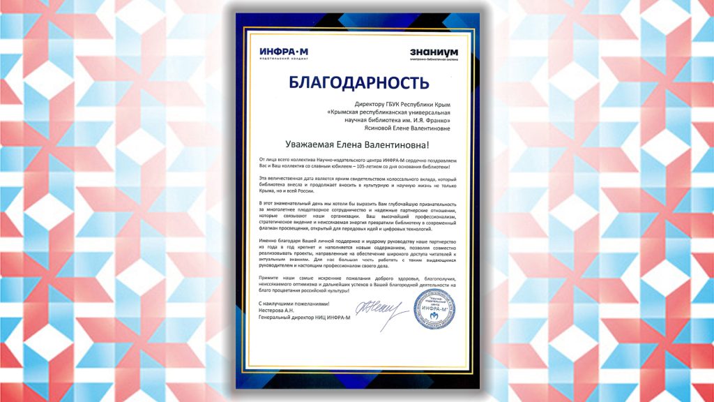 Поздравительный адрес от директора ГБУК г. Севастополя «Региональная информационно-библиотечная система», Заслуженного