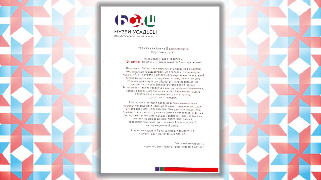 Поздравительный адрес от директора республиканских музеев в Алуште Светланы Немирович с