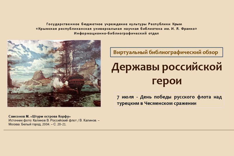 Специалисты информационно-библиографического отдела подготовили виртуальный библиографический обзор «Державы российской герои», приуроченный ко Дню победы русского флота над турецким в Чесменском сражении 7 июля 1770 года. С 2012 года этот день стал Днём воинской славы России.