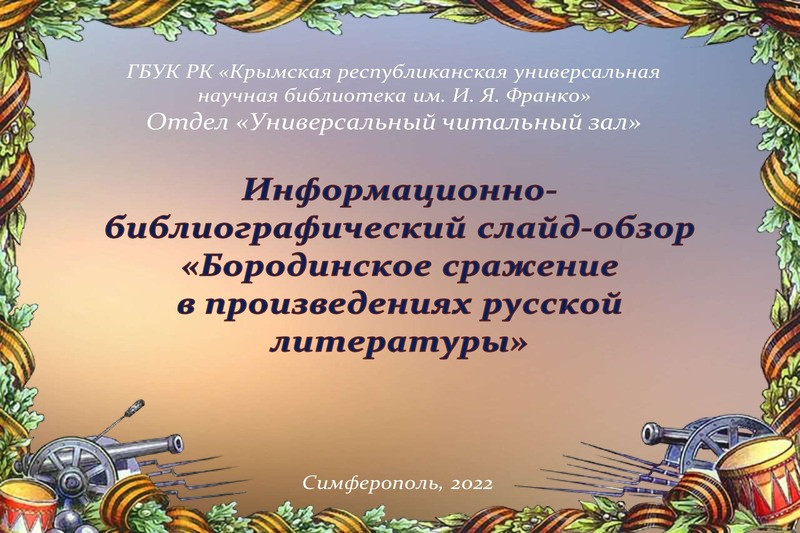 Специалисты отдела «Универсальный читальный зал» предлагают вниманию пользователей библиотеки информационно-библиографический слайд-обзор «Бородинское сражение в произведениях русской литературы», посвященный этой теме.