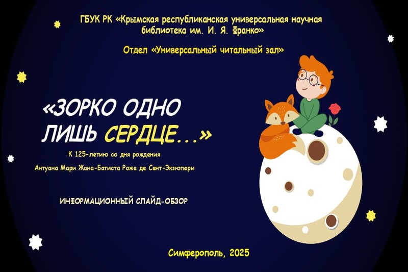 К 125-летию со дня рождения французского писателя, поэта и профессионального лётчика Антуана де Сент-Экзюпери, специалисты отдела «Универсальный читальный зал» подготовили информационный слайд-обзор «Зорко одно лишь сердце…». Виртуальные материалы знакомят пользователей  с интересными фактами судьбы легендарного лётчика, его жизненной позицией, гранями литературного таланта.