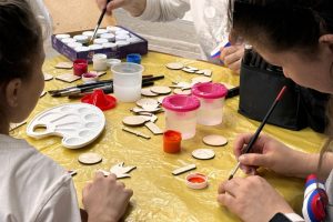 Гости интенсива попробовали свои силы в выжигании рисунков на деревянных основах, а также разрисовывали их акриловыми красками и маркерами. В качестве деревянных основ были взяты символы Победы и СВО.