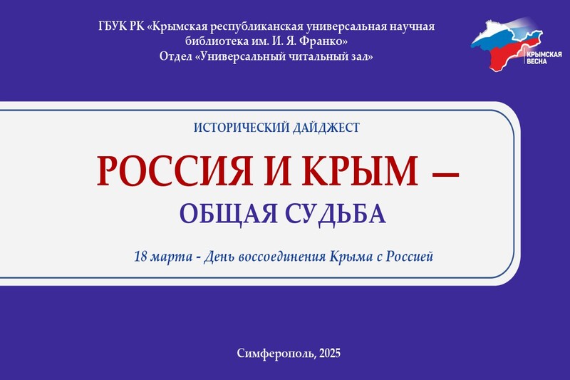 Специалисты отдела «Универсальный читальный зал» подготовили исторический дайджест «Россия и Крым – общая судьба», приуроченный к этой дате. Виртуальные материалы знакомят пользователей с событиями общей истории России и Крыма, их судьбоносными последствиями и современными достижениями благосостояния полуострова, которые стали возможны благодаря возвращению Крыма в состав России. Наглядным дополнением дайджеста стала тематическая подборка литературы из фонда КРУНБ им. И. Я. Франко. Полезного просмотра!