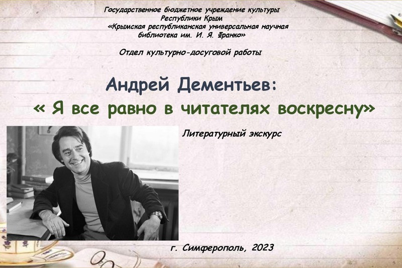 Специалисты отдела культурно-досуговой работы в рамках республиканского проекта «Читающий Крым» подготовили литературный экскурс «Я все равно в читателях воскресну», посвященный 95-летию со дня рождения Андрея Дементьева.