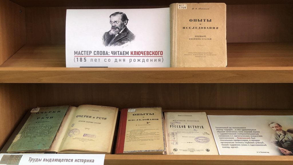 Вниманию посетителей также будет предложен сборник «В. О. Ключевский: характеристики и воспоминания», посвященный памяти ученого. В издание вошли статьи А. С. Лаппо-Данилевского, А. Ф. Кони, А. А. Кизеветтера, Ю. В. Готье и других. В материале дается всесторонняя оценка научной и преподавательской деятельности В. О. Ключевского.