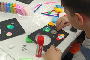 В отделе городского абонемента состоялся интенсив «Навстречу звездам» для подростков из благотворительного фонда «Особый взгляд». Участники погрузились в творческий процесс: они создавали объемные открытки с изображением планет, звезд и ракет, используя воздушный пластилин. Работа с материалом позволила ребятам проявить фантазию – каждая поделка превратилась в миниатюрную вселенную с необычными текстурами и цветами. Кроме того, для родителей прошла встреча с психологом, на которой была поднята актуальная тема воспитания подростков с расстройством аутистического спектра.