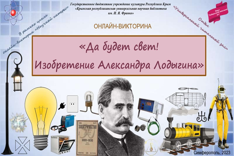 В рамках цикла онлайн-викторин «Научный интерес» специалисты отдела «Универсальный читальный зал» подготовили интеллектуальную игру, посвященную жизни и научной деятельности русского изобретателя Александра Николаевича Лодыгина.