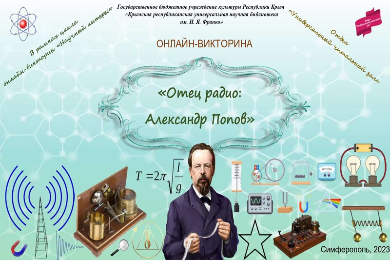 В рамках цикла онлайн-викторин «Научный интерес» специалисты отдела «Универсальный читальный зал» подготовили интеллектуальную игру, посвященную жизни и научной деятельности первого российского радиотехника Александра Степановича Попова.