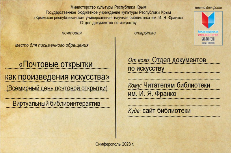 Специалисты отдела документов по искусству предлагают к ознакомлению виртуальный библиоинтерактив «Почтовые открытки как произведения искусства», приуроченную к Всемирному дню почтовой открытки.