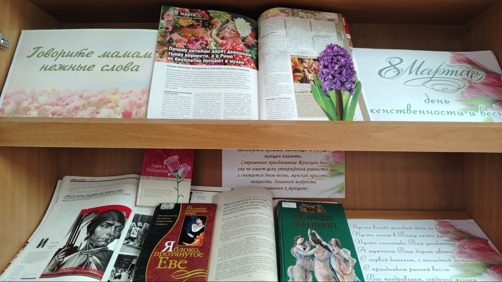 Книги и журнальные публикации, представленные в экспозиции, расскажут об истории возникновения праздника, о судьбах великих женщин разных эпох, чьи имена вписаны в историю страны, о секретах женской красоты. Выставка дополнена художественной прозой и стихотворениями, посвященными прекрасной половине человечества.