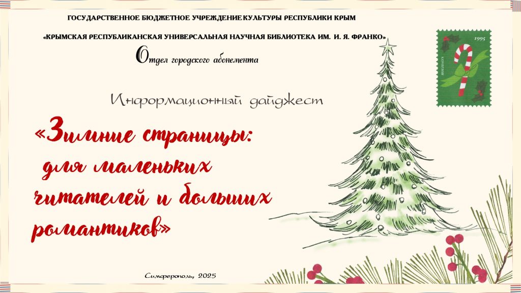 В преддверии зимних праздников отдел городского абонемента представляет информационный дайджест «Зимние страницы: для маленьких читателей и больших романтиков». Он станет вашим уютным проводником в волшебный мир литературы, согревающим душу в зимние вечера.