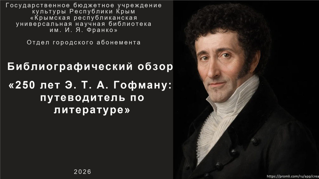 Специалисты отдела городского абонемента подготовили информационный библиографический обзор, приуроченный к 250-летию со дня рождения Эрнста Теодора Амадея Гофмана –  немецкого писателя-романтика, сказочника, композитора, художника, юриста.