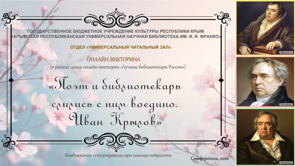 Специалисты отдела «Универсальный читальный зал» предлагают пользователям библиотеки принять участие в онлайн-викторине, посвященной жизни и творчеству выдающегося деятеля русской культуры XIX века Ивана Андреевича Крылова.