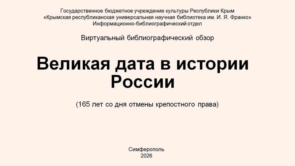 Специалисты информационно-библиографического отдела подготовили виртуальный библиографический обзор, приуроченный к 165-летию со дня отмены крепостного права в царской России. 3 марта 1861 года был подписан манифест «О всемилостивейшем даровании крепостным людям прав состояния свободных сельских обывателей». Крестьянская реформа стала одним из самых важных и неоднозначных событий в истории России, о котором учёные спорят до сих пор.