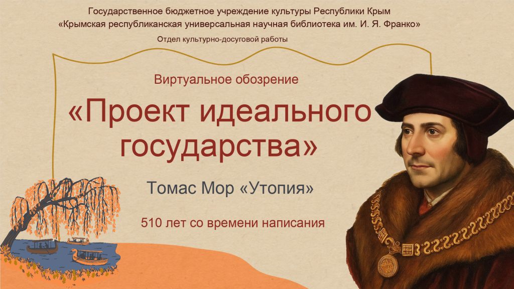К 510-летию со времени написания книги «Утопия» специалисты отдела культурно-досуговой работы подготовили виртуальное обозрение, посвящённое легендарному труду Томаса Мора. Человек глубокой веры и блестящего ума, он совмещал высокий государственный пост с созданием смелого литературного манифеста, где реальность причудливо переплелась с социальной сатирой и пророческим предвидением. Английский философ создал не просто книгу, а целую вселенную, наполненную тонкой иронией, критикой социального неравенства и гуманистическими идеалами. Его произведение бросило вызов современному ему миру и заложило основы европейской утопической мысли.